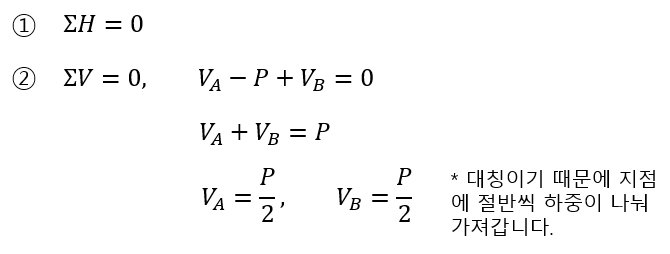그림1의 단순보의 경우 미지수가 $V_{A}, V_{B}$ 2개이므로 평형조건식 $\Sigma V=0$, $\Sigma M=0$, 2개의 방정식을 이용하여 구해도 되지만 좌우대칭이기 때문에 $\Sigma V=0$을 이용히 1개의 방정식으로 각 지점의 반력을 구할 수 있습니다.