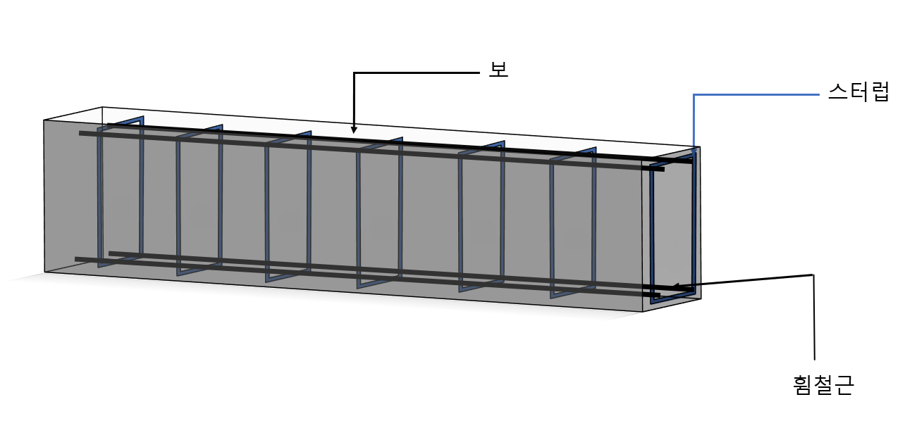 | 보 | 스터럽 | stirrup | 보의 주철근을 둘러싸고 이에 직각되게 또는 경사지게 배치한 복부보강근으로서 전단력 및 비틀림모멘트에 저항하도록 배치한 보강철근 |