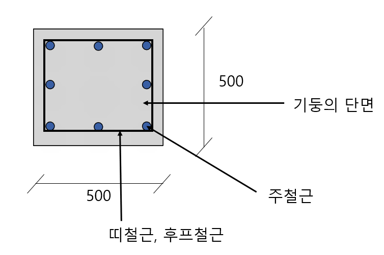 | 기둥 | 주철근 | main reinforcement | 주된 단면력이 작용하는 방향으로 휨모멘트와 축력에 저항하기 위하여 배치하는 철근 |