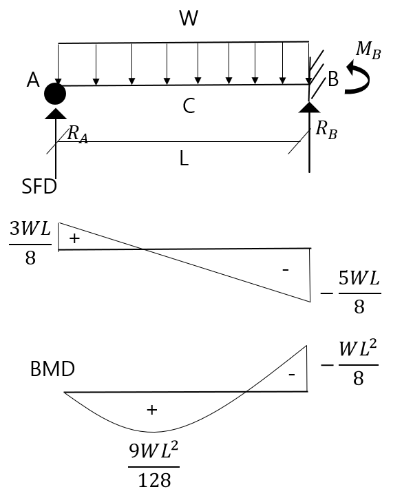 $M_{B} = - \dfrac{WL^2}{8} , M_{C} = \dfrac{9}{128}WL^2 $