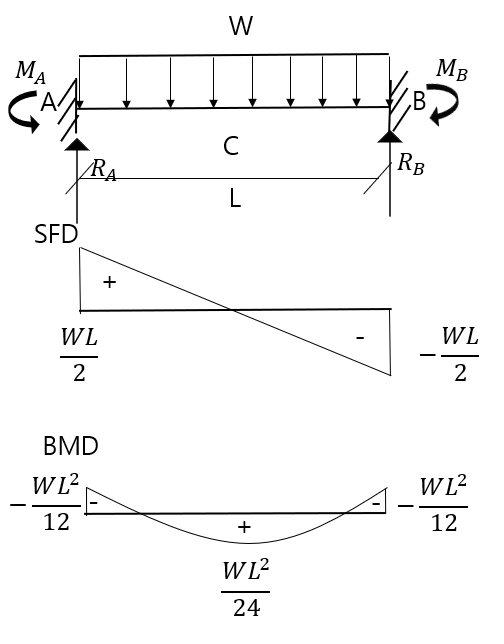 $M_{A} = M_{B} = - \dfrac{WL^2}{12} , M_{C} = \dfrac{WL^2}{24} $