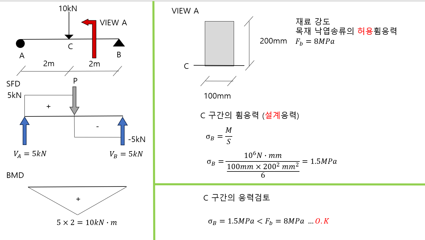 단면의 휨응력은 직사각형일 경우 중립축에서부터 가장 멀리 있는 축에서 가장 큰 휨응력이 발생하기 때문에 C의 축을 아래로 두었습니다. 단순보 중앙이기 때문에 상부는 압축응력, 하부는 인장응력을 받는 형태입니다.·
