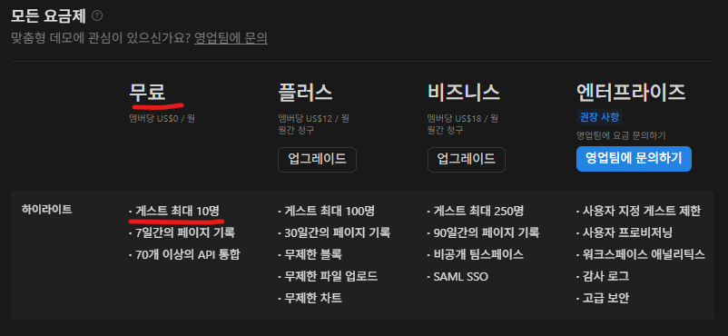 무료 요금제 사용자는 최대 10명의 게스트를 초대할 수 있네요.