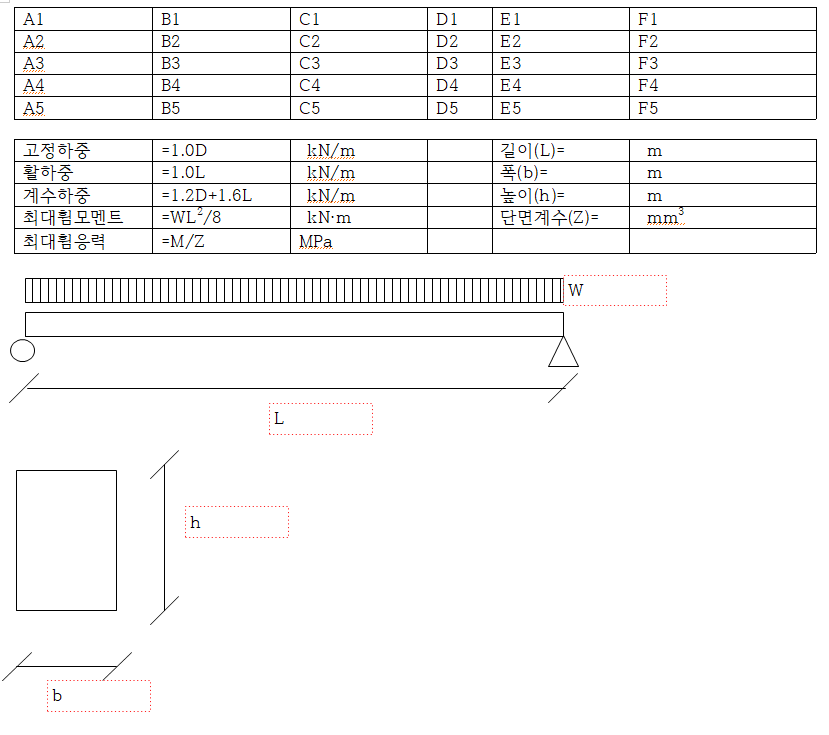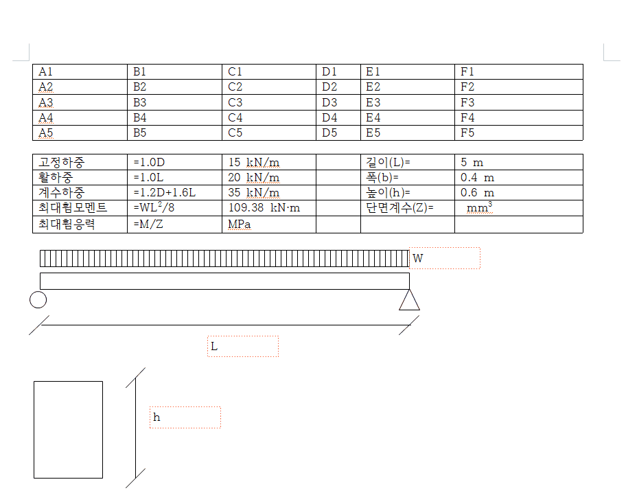 작성하다보니 계수하중에 있는 계산식을 잘못 작성되어 있는데, 이부분만 수정하면 계수하중을 이용해 계산된 식(최대휨모멘트, 최대휨응력)이 자동으로 수정되는 것을 확인할 수 있습니다.